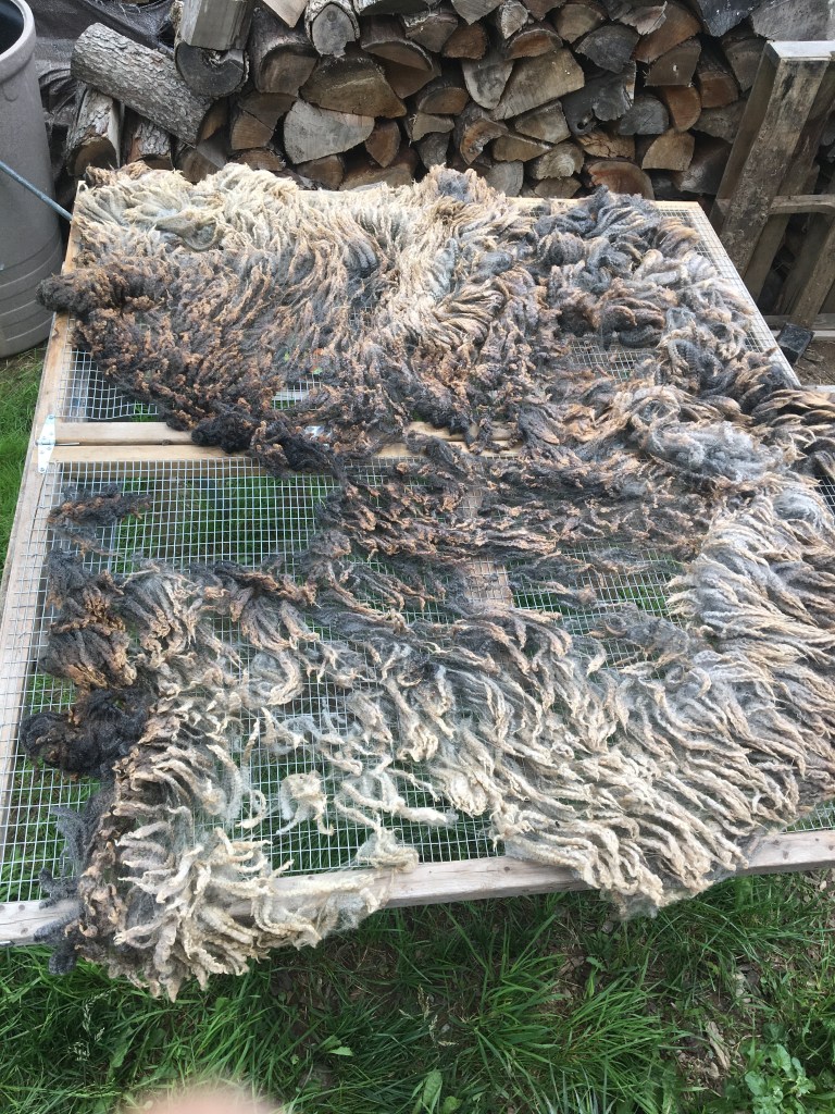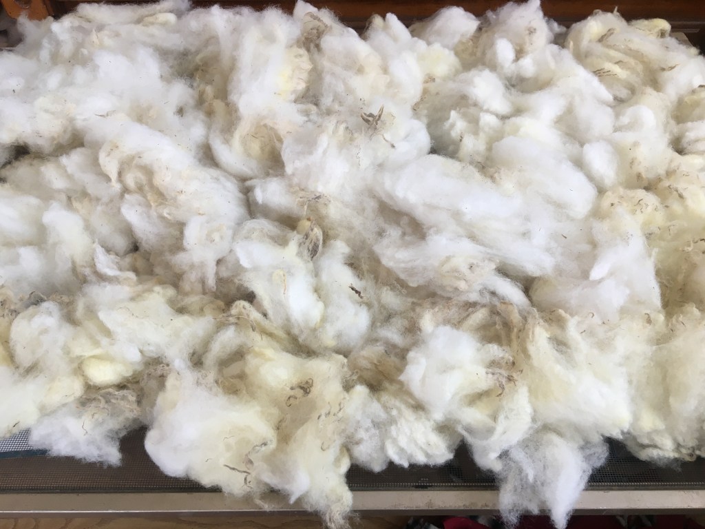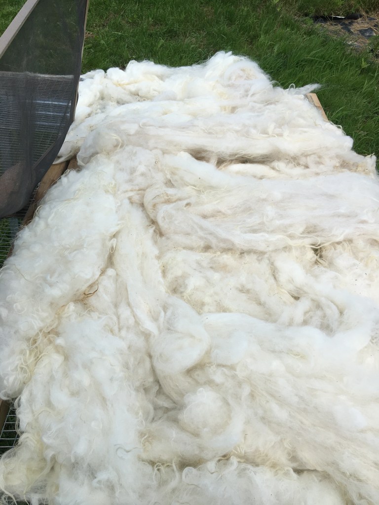 I skirted my fleece on a folding table I made from wood scraps and wire mesh. I set that up on sawhorses. I found that while overall I am happy with its construction and form, it should have been just a touch bigger to accommodate a fully laid out sheep’s fleece. Those things are big when laid out flat.