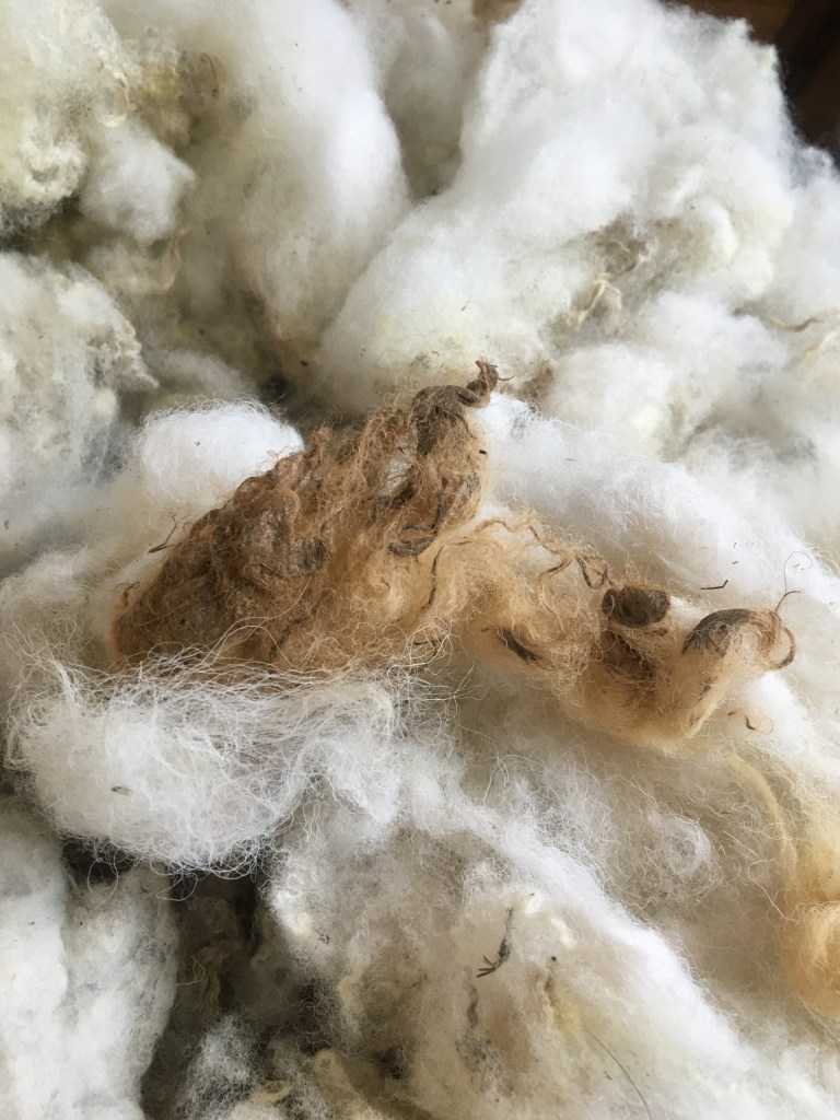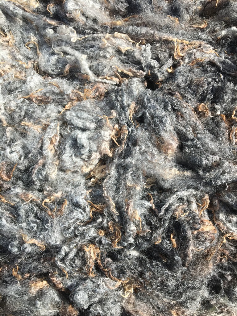 I waited until after the holidays to request fleeces from her to get started. And that time has come. I picked up two Babydoll Southdown fleeces from her this past weekend and I kind of couldn’t wait to get into them. I didn’t know anything about that breed and I’ve never worked with any down breeds in my short time working with sheep fleece. She told me that they are used for rug yarn; very coarse wool and basically useless as they were breed primarily for meat with the wool as an after-thought.