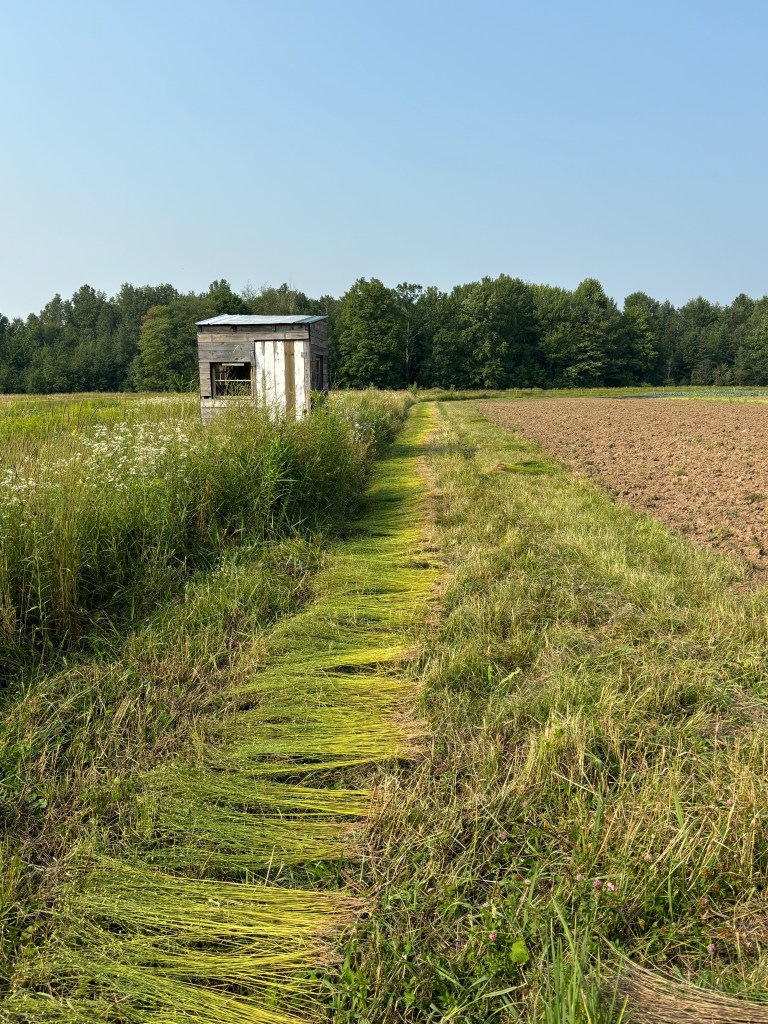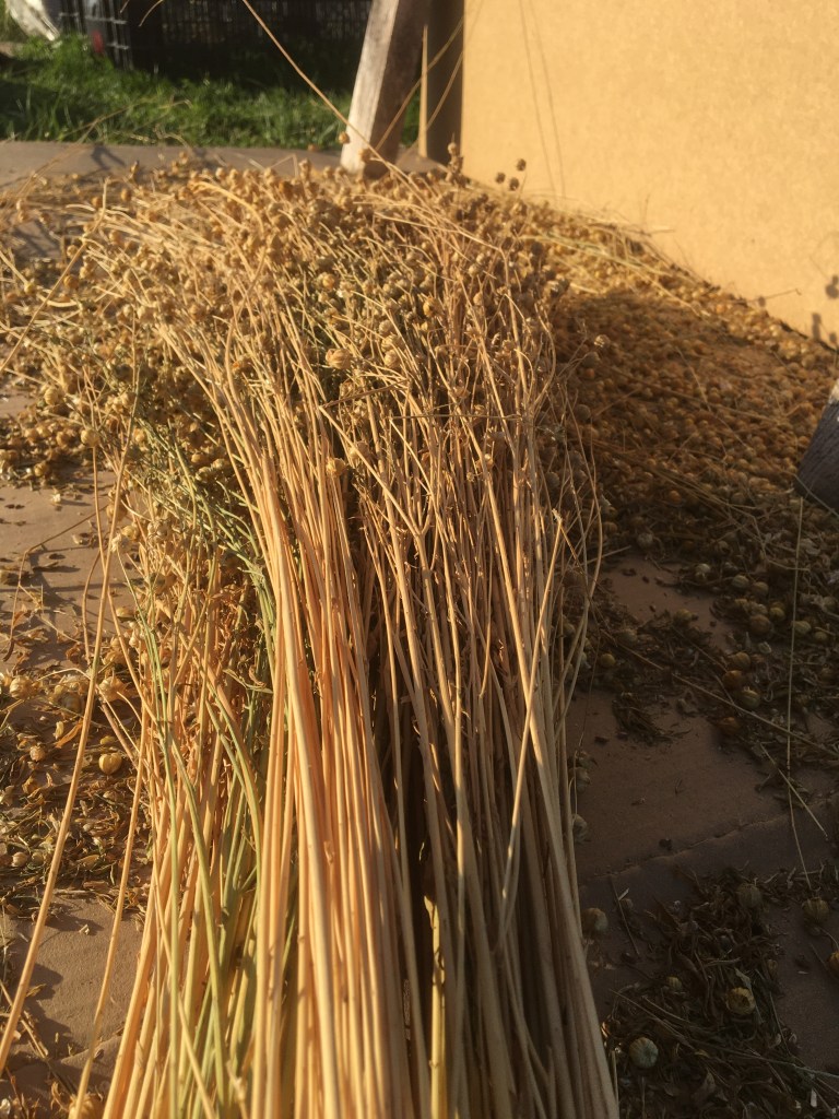 In May, I turned to processing my flax seeds and prepping the bed for planting. This year, in an exciting turn of events, rather than simply planting flax because it’s interesting, I actually had a goal for it. I am on the board of a newly forming fibershed (Northern Pines fibershed) group in my area, and late in 2024 we began making plans to host a Flax Harvest Day in cooperation with the Marathon County Chapter of Wisconsin Farmers Union and Midwest Linen Revival. The event was planned to take place in early August and while I usually plant my seeds in mid-April to be ready for harvest in mid-July I calculated that the later start would be just right for the planned later harvest.