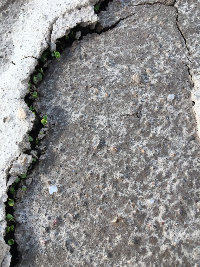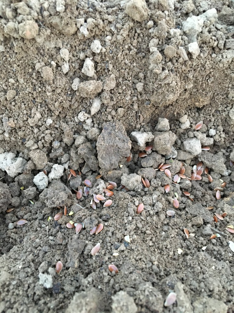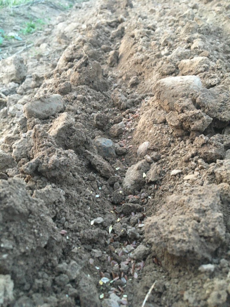 In early May, I pulled out some saved dry flax and rippled, crushed and winnowed the amount of seeds needed for the bed. I planted the seeds before a forecasted rain event which is important for germination. Unfortunately, the said forecasted rain turned out to be a massive storm with a torrential, pounding rain that lasted for about an hour and a half, and had me and my dog huddling in the farm packshed along with the farm owner’s family and their dog. My poor seed bed got the snot beat out of it, although luckily the seeds didn’t wash out. What the pounding rain did do, however, was wash extra soil over the top of the seeds and harden the surface of the soil into a packed, almost concrete surface. My seeds had to move mountains to push themselves through the soil. I’ve never seen it before but it was an inspiring thing to witness. Yes rain is important but I would prefer it if it was the right kind of rain!