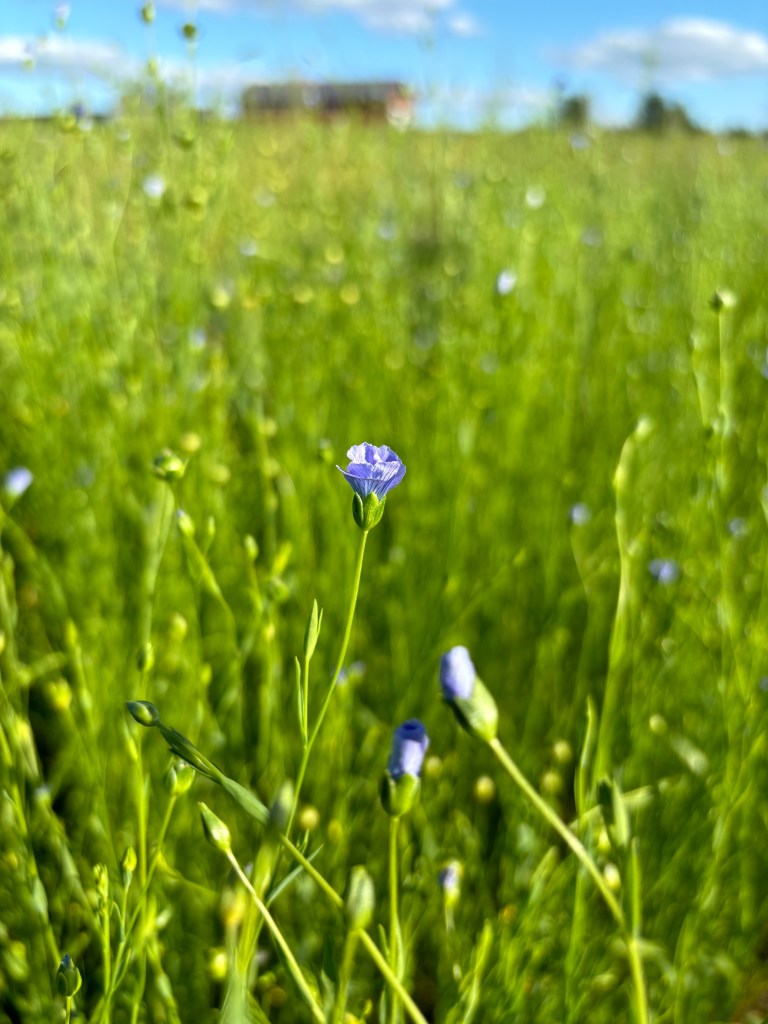 The flax flowers bloomed in July. It’s one of my favorite times of the year now, watching the flax bloom and the bumble bees fly from one flower to the next bending the stalks with their weight. The flowers only last a day so the result is beautiful purple blue confetti littering the ground below and fresh flowers above.