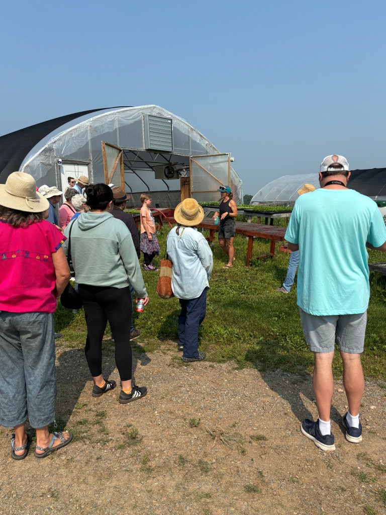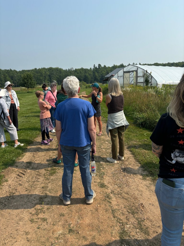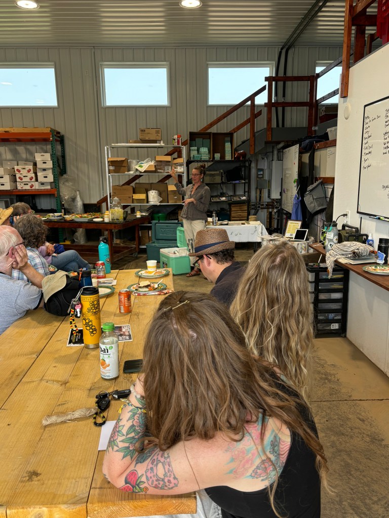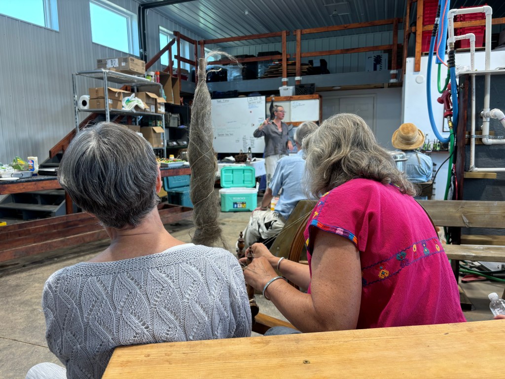 The Flax Harvest Event took place in early August and it was quite the success. We had about 40 people show up to my farm to learn about regional fiber systems with flax as the case study of the day. Northern Pines fibershed (that brand new fibershed I am helping to shepherd into existence) partnered with Midwest Linen Revival and Marathon County Farmers Union to make the event the ultimate success it was. There was tour of the farm lead by my generous employers, a general overview of how I plant and handle my flax stands, and an overview of processing equipment and the processing procedure. We took a break for a provided lunch where we learned from Leslie Schreoder about natural fibers and the work she is doing to build Midwest Linen Revival. Then after lunch we went back out to the flax stand and did the fiber harvest. It was a wonderful day of fiber fun, connecting with people and thinking about the big picture.