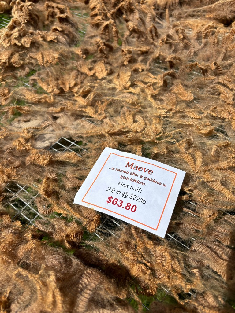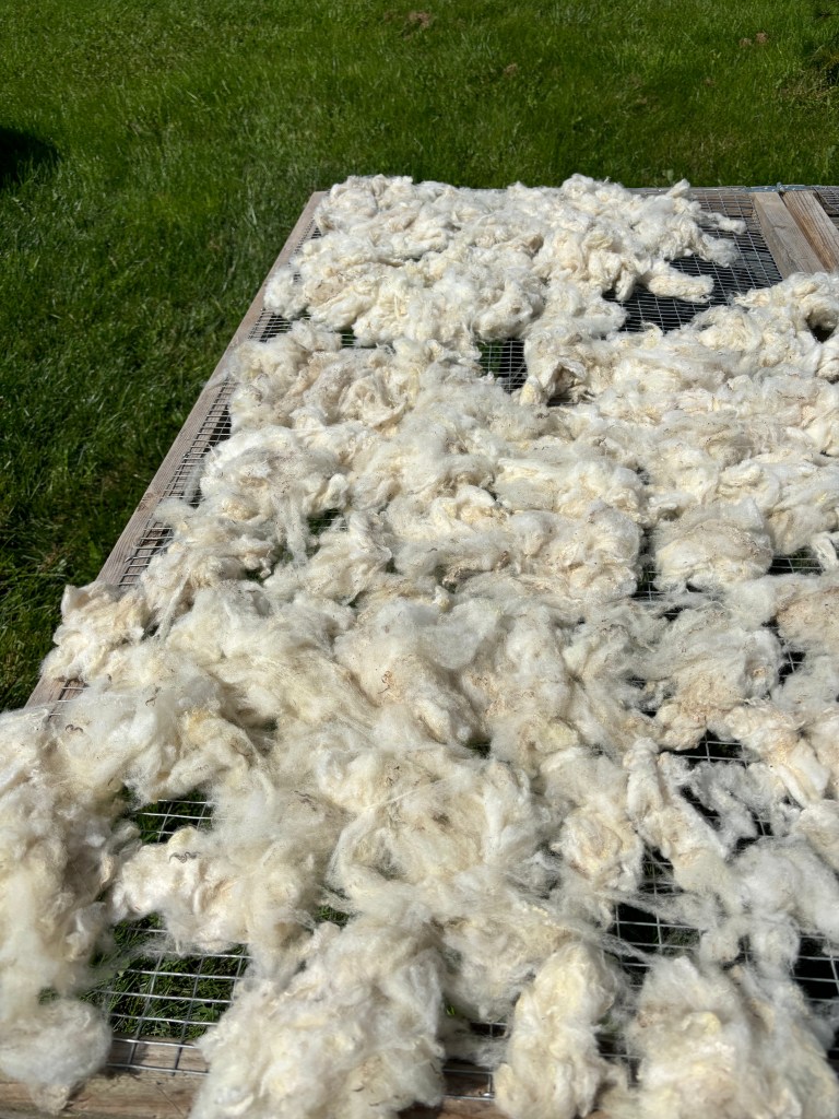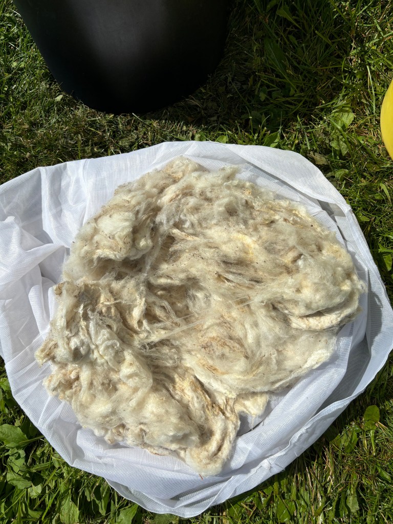 After that successful mile marker of the season, I turned my thoughts toward my wool stores. I had a few raw fleeces still waiting for their turn in the wash buckets. Luckily (but sadly) I didn’t go to any of this year’s nearby wool festivals, so other than Ruthie and Hope at the beginning of the year, I didn’t add to my raw fleece stash. Living in a small space as I do, I thought this year would be a good opportunity to get through the stash and empty the shelves. I washed a beautiful Corriedale lamb fleece named Maeve. You’ll be hearing more about her in an upcoming post so I won’t give away too much. I finished washing the Babydoll Southdown fleeces from last winter that I borrowed to practice on (yes, that project was looooong past due but luckily the owner of the fleeces barely remembered I had them…). I rewashed a ram’s fleece that was still very tacky with grease; he came out much nicer this second go round. And I started washing the 2025 fleece from Hope. I’m planning on continuing the wool washing through December and January so it can be totally finished by 2026 wool festival season.
