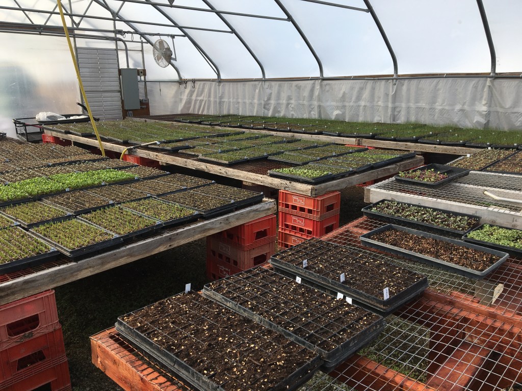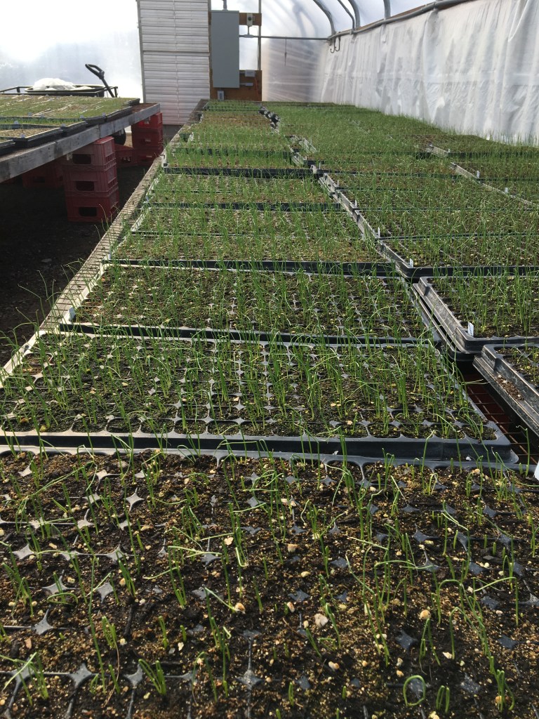 We start planting in the greenhouse in March; the first plants to get planted in our hoophouses are in April. The very first plants planted in the field are the ever-hardy onions, which go out in late April or early May depending on when the weather permits us to get into the field to make beds and such. We have such a tight turn around to make sure that plants get into ground in time to reproduce before the frosts return and shortening daylight makes it hard for the leaves to photosynthesize.