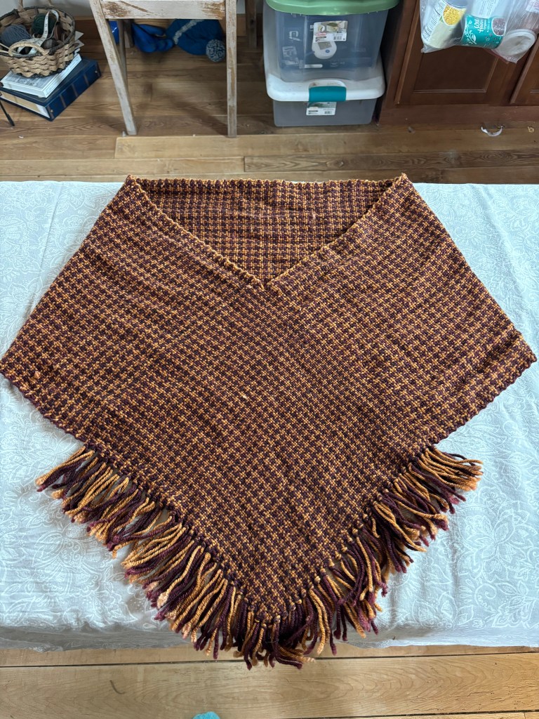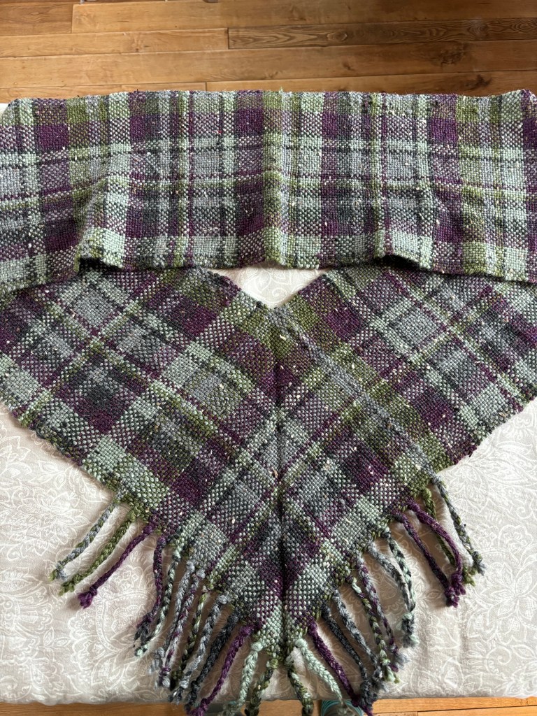 Here’s my recently finished v-cowl. The fun thing about this latest iteration of the project is the plaid. I really wanted to try my hand at creating a plaid pattern and I chose the v cowl project as the introduction into the plaid color work. I made the pattern up as I went along the warp, simply changing color whenever I felt the desire. We’ll go over how I felt about that at in the How did it go? section. But before we get into that let me get you the technical information I used to make the v-cowl.